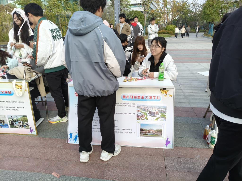 嘉年华伊始,青年马克思主义研学社的摊位前便吸引了众多学子驻足。社团成员化身“理论宣传员”,热情引导同学们参与“马克思主义知识大挑战”竞答活动。“‘两个确立’的具体内容是什么?”“中国共产党的初心和使命是什么?”面对一道道紧扣时代脉搏的题目,参与者们或凝神思索,或热烈讨论。答对题目后,他们收获的不仅是精美奖品,更是一次深刻的思想洗礼。社团指导老师也亲临现场,与同学们深入交流,耐心解答理论学习中的困惑,引导大家运用马克思主义的立场、观点、方法来分析和洞察现实问题。