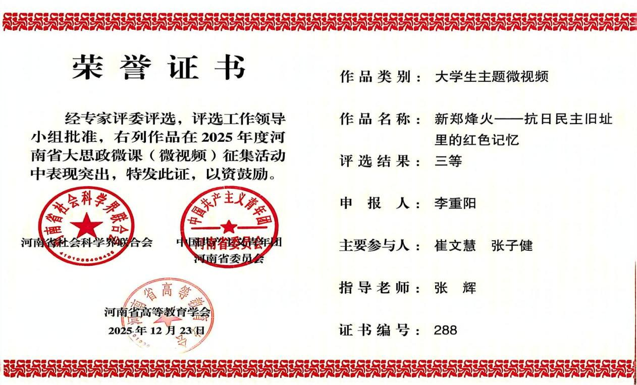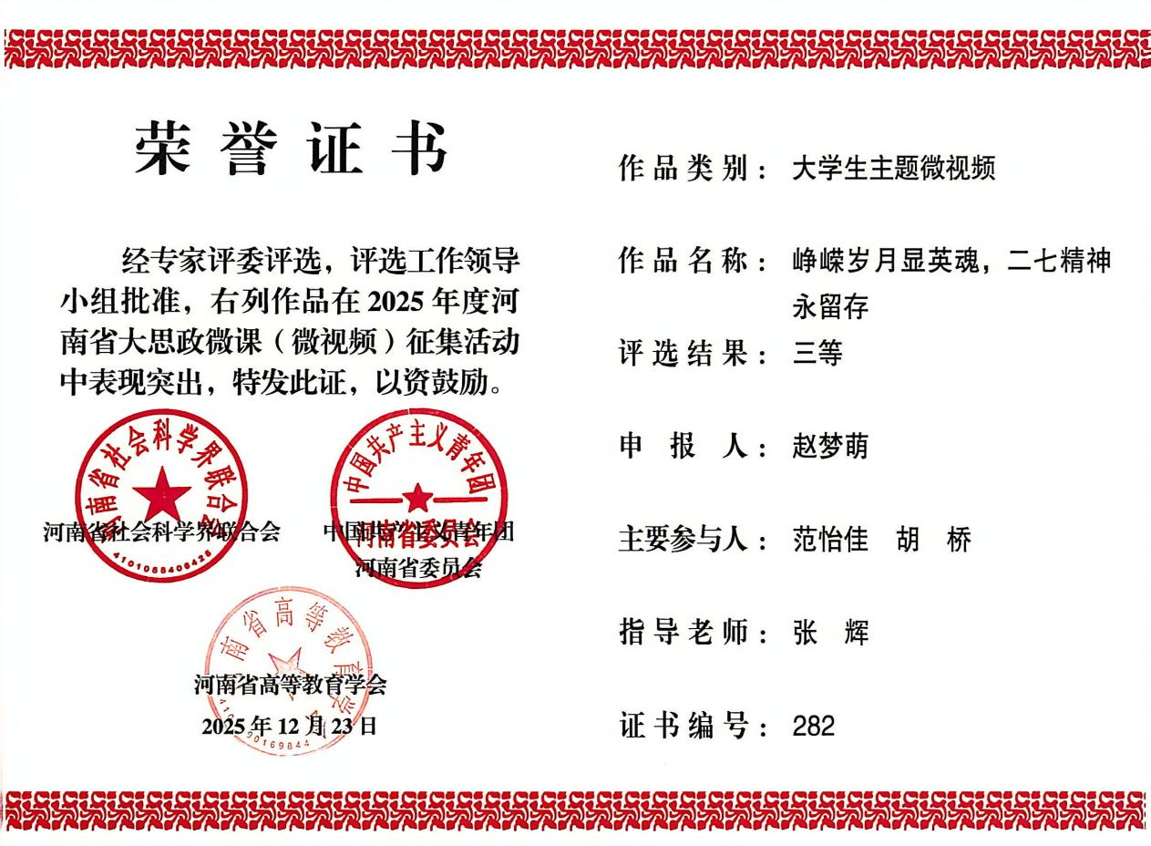 由河南省社会科学界联合会、中国共产主义青年团河南省委员会、河南省高等教育学会联合发布的《关于公布2025 年度河南省大思政微课(微视频)征集活动评选结果的通知》(豫社科联字〔2025〕22 号)正式揭晓。我院在“大学生主题微视频”赛项中表现优异,共斩获二等奖1项、三等奖2项。