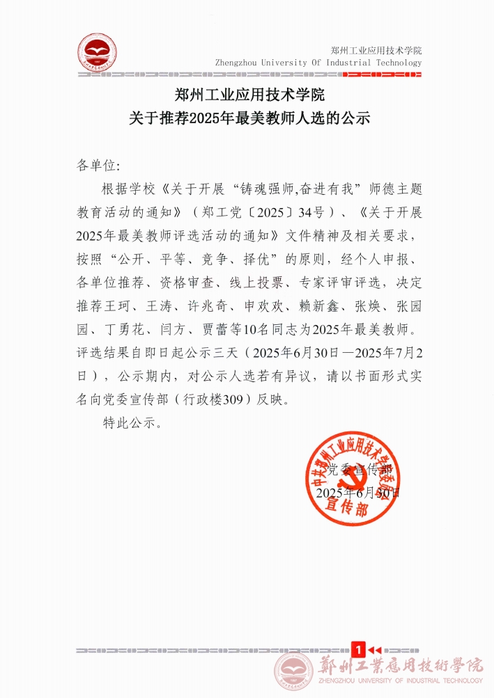 郑州工业应用技术学院关于推荐2025年最美教师人选的公示